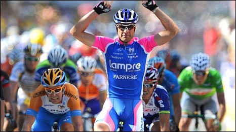 | Petacchi wins stage 4 with a victory salute. Julian Dean in orange and blue is to the left of the photo. Edvald Hagen Boasson in blue is tucked behind Petacchi to the right of the photo. Image credit Pascal Pavani/AFP/Getty Images at Yahoo |